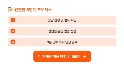 빠른 처리: 상담부터 입금까지 평균 3분 내 완료됩니다.